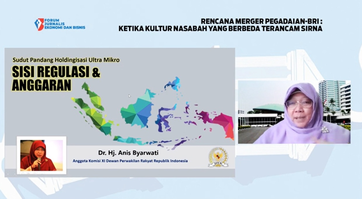 Dalam Webinar ini, Anggota Komisi XI DPR RI Dr. Anis Byarwati dengan tegas mengatakan bahwa, Holding Ultra Mikro- BRI, Pegadaian dan PNM bukan jawaban untuk peningkatan UMKM. Webinar yang juga menghadirkan sosok ekonom Prof. Faisal Basri dan Piter Abdullah ini berlangsung interaktif dengan banyak pertanyaan dari para pemirsa yang kebanyakan menanyakan apakah proses holding ini benar-benar akan terwujud dan apakah akan berdampak positif bagi masyarakat khususnya UMKM.